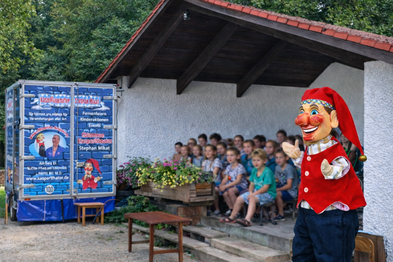 Tri, Tra, Tralala – der bairische Kasperl ist wieder da und kommt in den Musik-Pavillon im Kurpark Bergen im Chiemgau. Die Zuschauer sitzen überdacht.